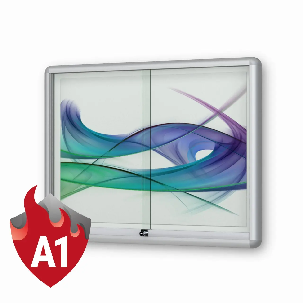 Merkmale Schaukasten: Brandschutz, Unfallschutz (gerundete Kanten), Wandmontage, abschliessbar, magnetisch, mit Schiebetüren